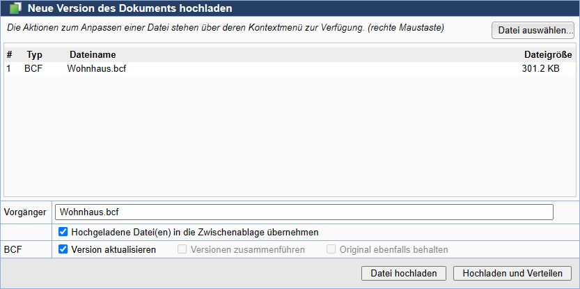 Falls hierbei die Option Version aktualisieren angewählt ist, wird die vorhandene BCF-Datei mit der neuen Version überschrieben. Hierbei sind einige Regeln zu beachten: