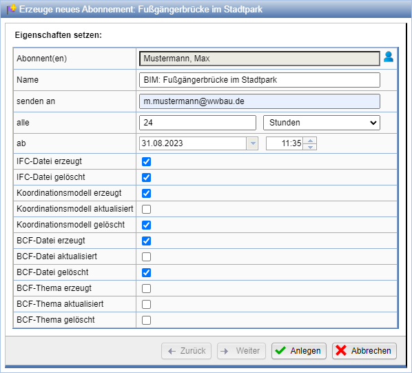 Durch das Abonnement wird der Nutzer regelmäßig per E-Mail über Aktivitäten innerhalb der BIM-Komponente benachrichtigt. Hierbei können die Parameter des Abos (Name, Peridode, Startzeit, Objekte, etc.) frei gewählt werden.