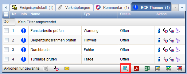Analog zum BIM-Viewer und IFC-Dateien steht für BCF-Dateien der BCF-Viewer zur Verfügung. Sind IFC- und BCF-Datei verknüpft oder befinden sich im gleichen Index, so kann der BCF-Viewer direkt aus dem BIM-Viewer geöffnet werden.