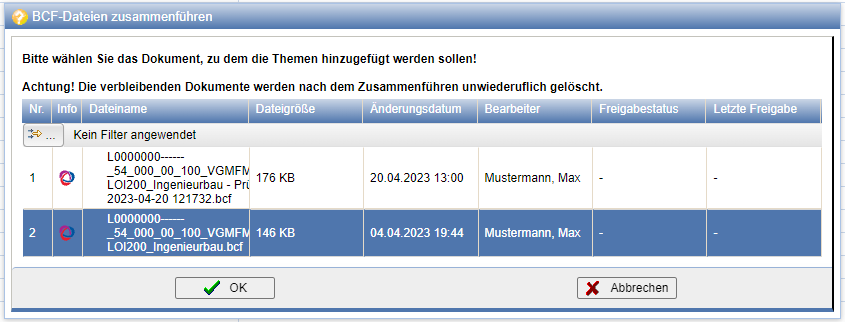 Mehrere sich auf dem PlanTeam-SPACE befindende BCF-Dateien können über die Aktion BCF-Dateien zusammenführen in Tabellen zu einer BCF-Datei zusammengeführt werden. Hierbei wird eine BCF-Datei ausgewählt, in die die Themen der anderen BCF-Datei integriert werden. Die zweite BCF-Datei verfällt hierbei.