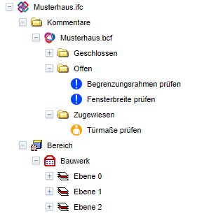 Sofern zu einem Modell BCF-Kommentare vorhanden sind, werden diese zusätzlich in der Baumstruktur dargestellt. Somit können alle zugehörigen Kommentare schnell erreicht werden.