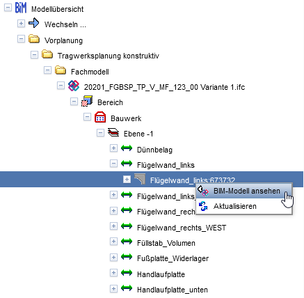 In der BIM-Komponente werden links in der Baumstruktur alle IFC-Dateien aus der Dokumentation aufgelistet. Darunter befindet sich, je nach Konfiguration, ggf. die Bauwerksstruktur, welche sich in weitere Kategorien unterteilen kann. Mit der Aktion BIM-Modell ansehen im Kontextmenü eines Bauteils und auf dessen Eigenschaftenseite kann dieses direkt im BIM-Viewer angezeigt werden.