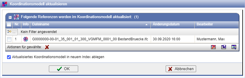 Diese Koordinationsmodelle können über deren Kontextmenü in der BIM-Komponente aktualisiert werden. Wählen Sie hierzu die Aktion Koordinationsmodell aktualisieren. Das neue Koordinationsmodell kann hierbei optional in einem neuen Index abgelegt werden.