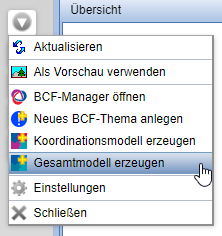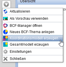 Zusammengehörige Fachmodelle können in einem Koordinationsmodell vereint werden. Hierfür werden die jeweiligen Modelle im BIM-Viewer kombiniert dargestellt. Anschließend wird im Dropdown-Menü die Aktion Koordinationsmodell erzeugen gewählt.
