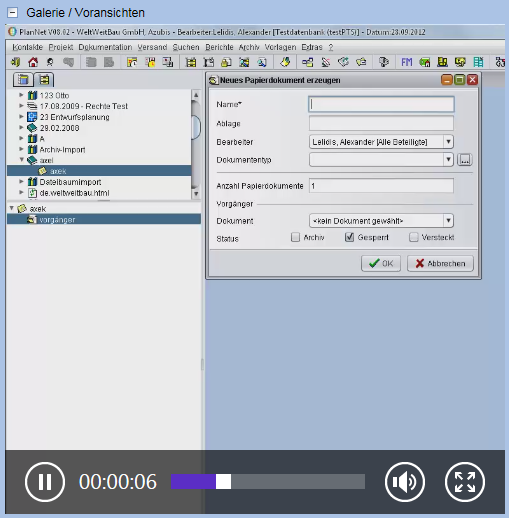 Wenn sich in der Dokumentation ein Video in dem Format .mp4 befindet, besteht in der Galerie der Dokumentenmappe und in der der Datei die Möglichkeit dieses abzuspielen.