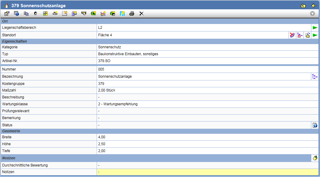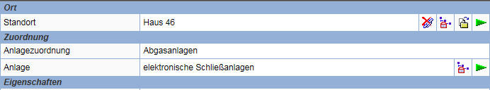 Besitzt ein Anlageteil eine Zuordnung zu einer Anlage bzw. ein Gerät zu einem Anlageteil, so wird diese auf der Eigenschaftsseite unter dem Standort dargestellt.