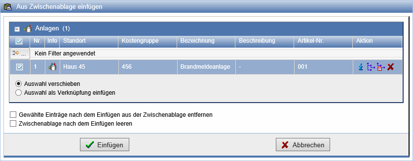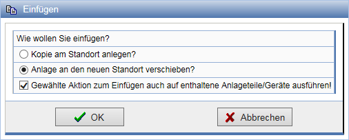 Um die Anlage als Kopie am neuen Standort einzufügen, setzten Sie den Haken bei Auswahl als Kopie einfügen. Um die Anlage an den neuen Standort zu verschieben, setzten Sie den Haken bei Auswahl verschieben. Beim Verschieben können Sie entscheiden, ob die enthaltenen Anlageteile und Geräte ebenfalls verschoben werden sollen. Falls Sie das wünschen, setzen Sie den Haken bei der Auswahl Gewählte Aktion zum Einfügen auch auf enthaltene Anlageteile/Geräte ausführen!.