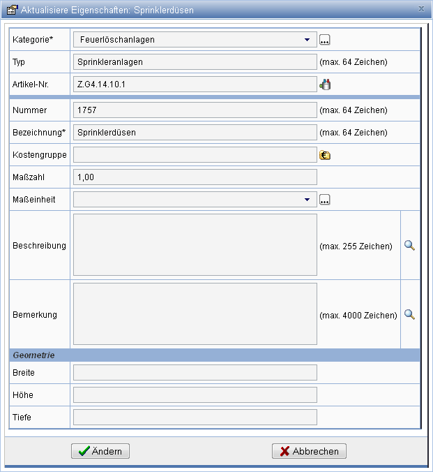 können Sie die Eigenschaften der Anlage bearbeiten: