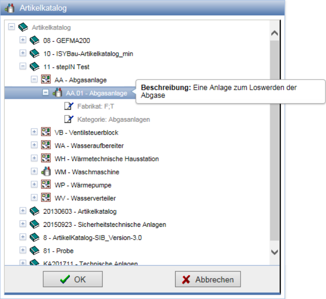 Sofern Beschreibungen im Katalog zu den Anlagenteilen vorliegen, werden diese als Tooltip angezeigt. Halten Sie dazu einfach den Mauszeiger über die Position im Katalog.