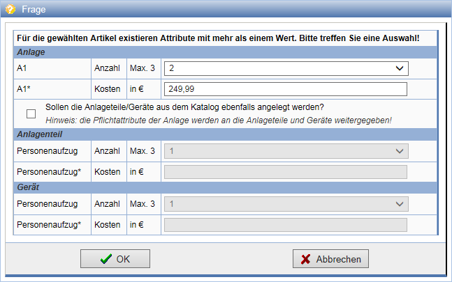 Besitzt die ausgewählte Anlage variable Attribute, so werden diese nach der Auswahl abgefragt. Ggf. werden ebenfalls die variablen Attribute für die Anlageteile & Geräte darunter abgefragt: