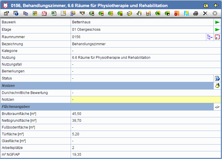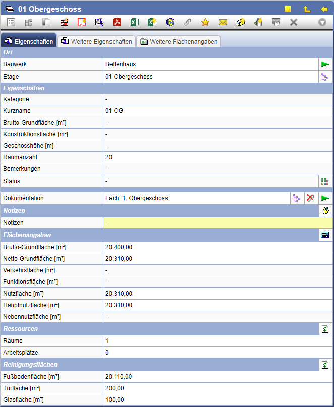 Unter den Stammdaten finden Sie im Datenblatt des Raumes weitere Attribute, die nutzerspezifisch angelegt werden können, sowie eventuell verknüpfte Dokumente.