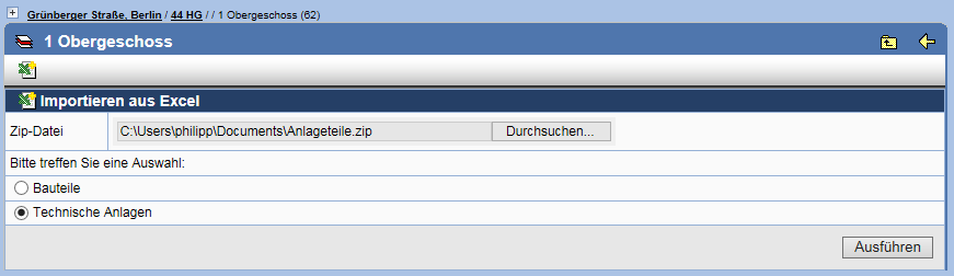 so kommt man auf die Seite, bei der man die Objekttypen Bauteile und Anlagen separat importieren kann.