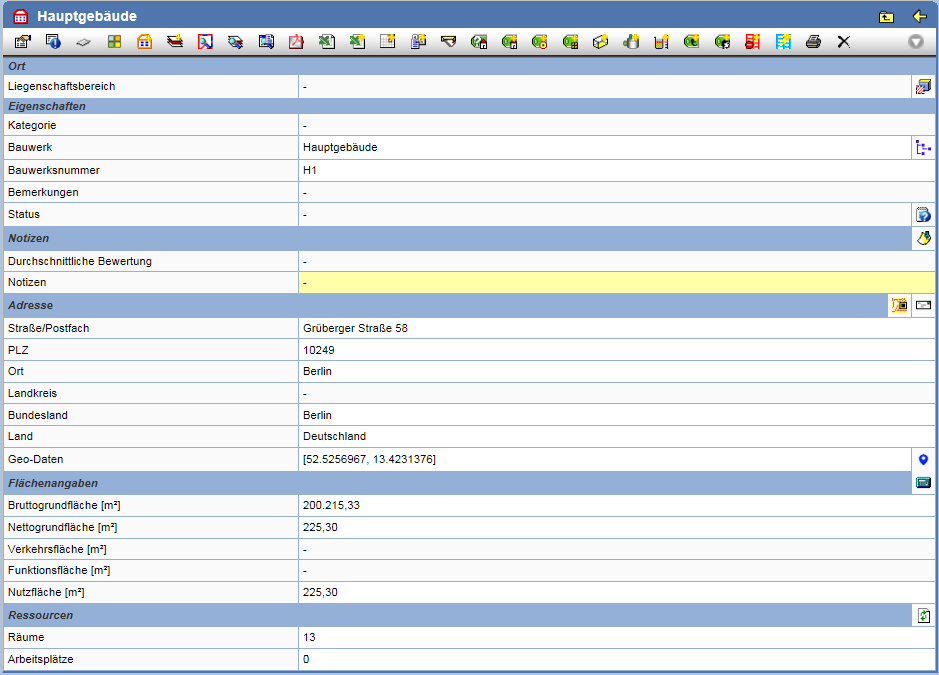 Durch Markieren eines Liegenschaftsbereiches im Baum wird die Eigenschaften-Seite geöffnet.