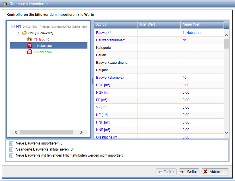 Nach klicken von "Ausführen" öffnet sich ein neuer Dialog, bei dem Schritt für Schritt die einzelnen, zu importierenden Objekte durchgegangen werden. Dabei wird zwischen neuen, unveränderten und geänderten Objekten unterteilt. Objekte, die fehlerfrei sind und ohne weiteres importiert werden können, werden grün dargestellt. Fehlt ein Pflichtattribut oder ist ein Attribut falsch, so ist das Objekt rot. Durch klicken auf ein Objekt werden rechts in der Tabelle die dazugehörigen Attribute mit gegebenenfalls ihrem alten und neuen Wert angezeigt. Fehlende Pflicht- und falsche Attribute werden hervorgehoben. Nacheinander werden die Objekte Bauwerke, Etagen, Räume, Bauteile & Anlagen abgefragt, sofern enthalten.