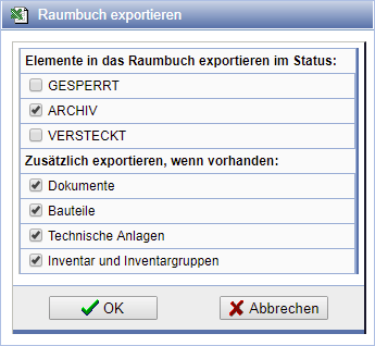 Anschließend entscheiden Sie, ob Elemente mit dem Status gesperrt, archiv oder versteckt beim Export zu berücksichtigen sind. Außerdem können Sie hier festlegen, dass verknüpfte Dokumente, Bauteile, Anlagen bzw. verknüpftes Inventar und Inventargruppen ebenfalls exportiert werden.