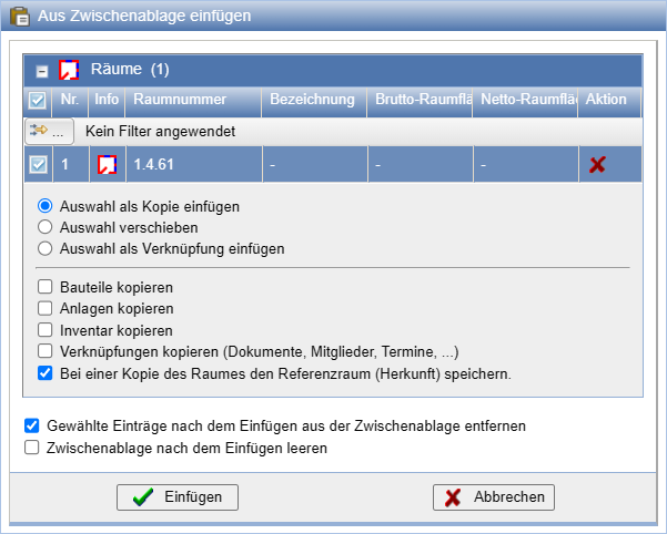 Über die Zwischenablage können Räume an neue Orte verschoben oder kopiert werden. Beim Kopieren besteht die möglichkeit, den ursprünglichen Ort als Referenz zu speichern.