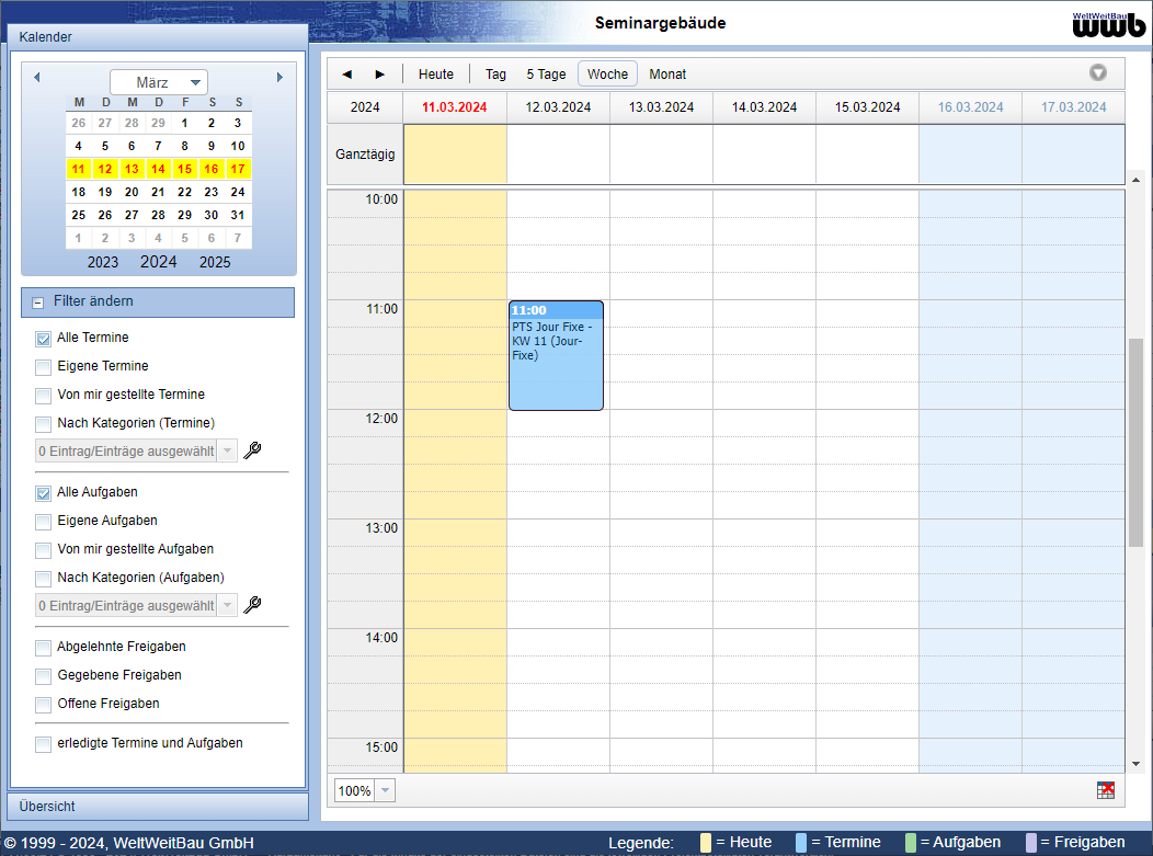 Alle Termine Blendet alle in dem Projekt angelegten Termine ein. Die Termine anderer Personen werden nur dann angezeigt, wenn Sie die Rechte als Projektmanager oder Projektleiter haben, oder im Server der lesende Zugriff auf Termine für alle konfiguriert wurde.