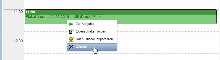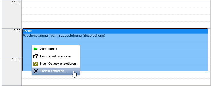 Um einen Termin über den Kalender zu löschen, öffnen Sie das Kontextmenü des Termins mit der rechten Maustaste und wählen Sie Löschen/Termin entfernen .