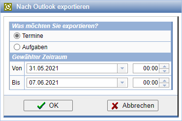 Über das rechte obere Symbol oberhalb der Kalenderanzeige können Sie den Inhalt des Kalenders aktualisieren, drucken oder schließen. Ferner können hier die angezeigten Termine oder Aufgaben nach Outlook exportiert werden.