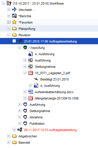 In der Prozesssteuerung werden die Workflows nach ihren Kategorien sortiert dargestellt. Unter Abgebrochen und Beendet werden abgebrochene bzw. regulär beendete Workflows aufgeführt. Unterhalb der Workflows werden die Stationen und weitere Objekte wie Verbindungen zu Folgestationen, enthaltene Dokumente und verknüpfte Aufgaben dargestellt.