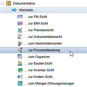 Prozesse (Workflows) werden über die Prozesssteuerung verwaltet. Sie gelangen zur Prozesssteuerung, indem Sie im Baum auf der linken Seite Wechseln und zur Prozesssteuerung wählen.