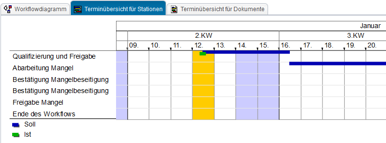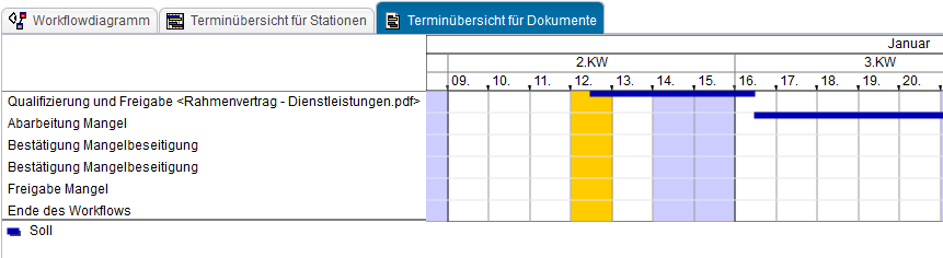 stellt eine Übersicht der Dokumente mit einem zeitlichen Soll/Ist-Abgleich in einem Kalender dar.