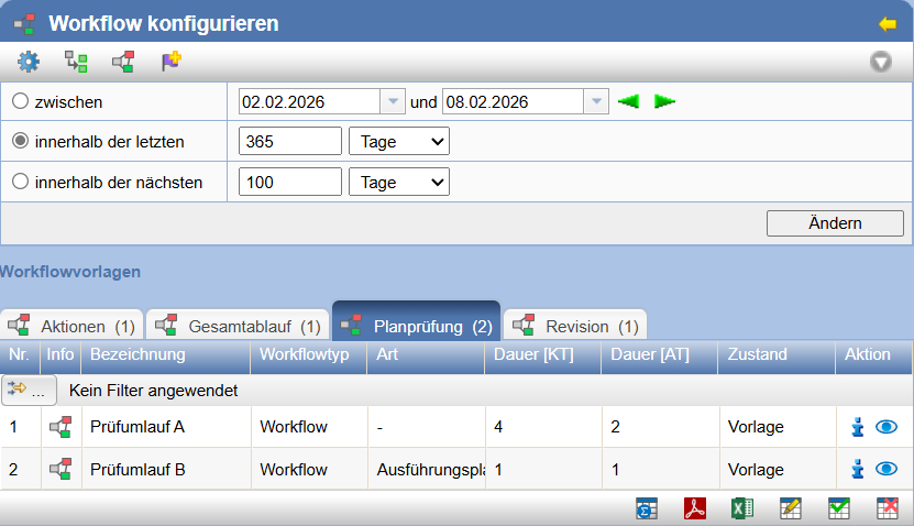 Durch die Wahl des obersten Knotens Workflows im Baum auf der linken Seite, können Sie den Darstellungszeitraum