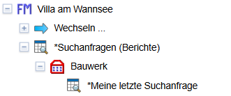 Neben den gespeicherten persönlichen und zur Verfügung gestellten Suchberichten enthalten die Übersichten innerhalb eines Projekts Ihre zuletzt für den entsprechenden Objekttyp durchgeführte Suchanfrage, die so erneut ausgeführt, geladen und gegebenenfalls zu Ihren permanent gespeicherten Suchanfragen hinzugefügt werden kann.