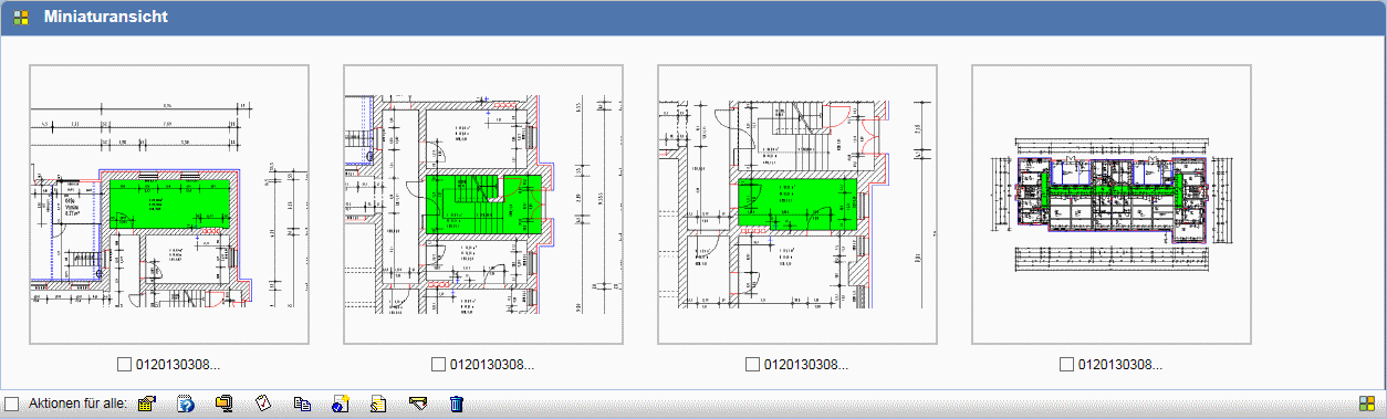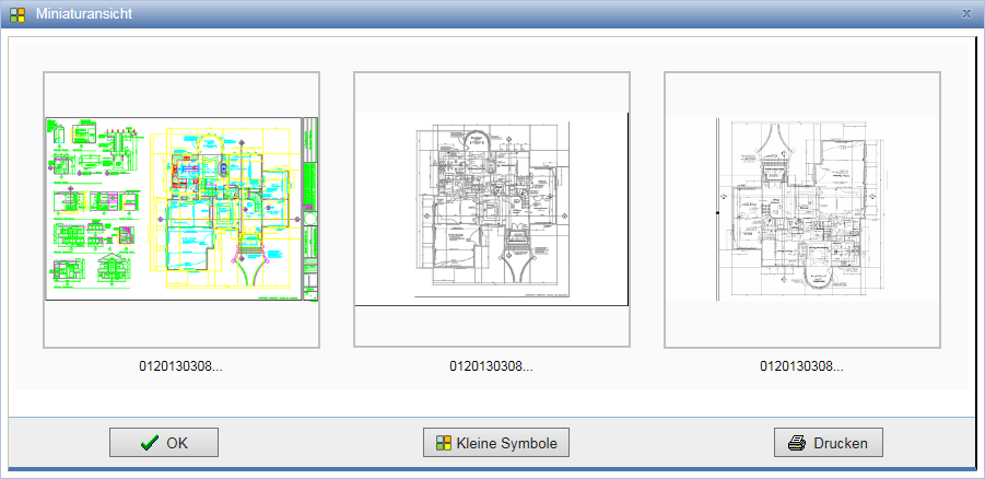 Bei Indizes zu Planmappen öffnet sich ein zusätzlicher Dialog, welcher die CAD-Dokumente als Miniaturansicht darstellt.