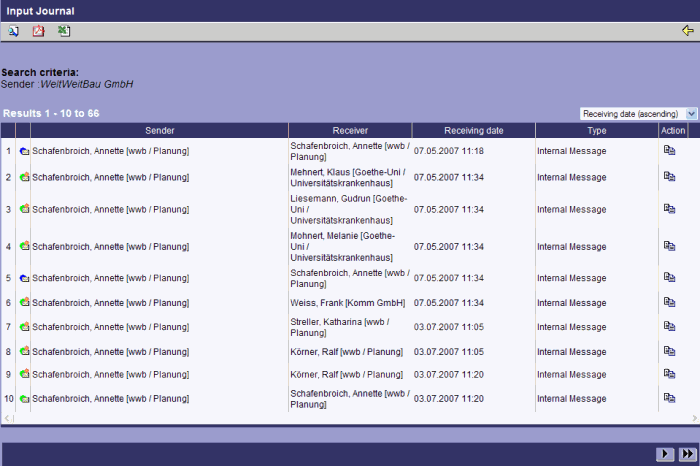 In the incoming log, information is collected about all documents which entered the documentation via the PlanTeam-SPACE. Also, all incoming messages are protocoled. For example, it is possible to determine which project member added which documents in a given time period.