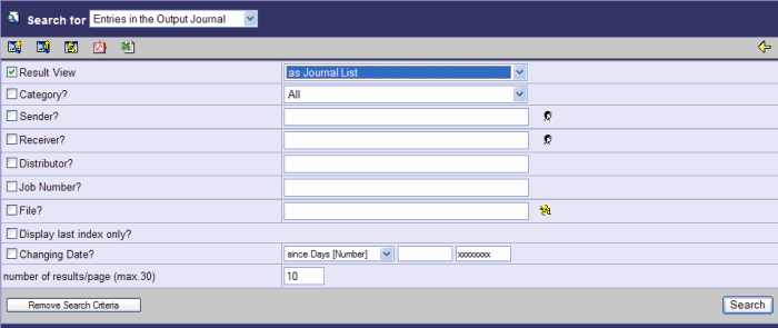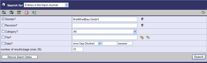Enter the desired search criteria and start the search mit Search. You can specify the type of result display as well as the category of register entries you are looking for. In the field e-mail (recipient), you can enter the recipient's e-mail address in order to constrain the search results.