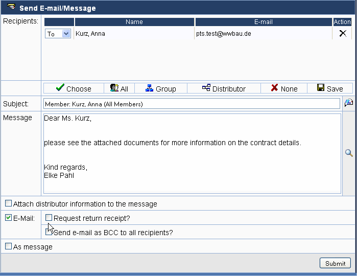 If all data is entered, the e-mail/internal message is sent by clicking on Submit.