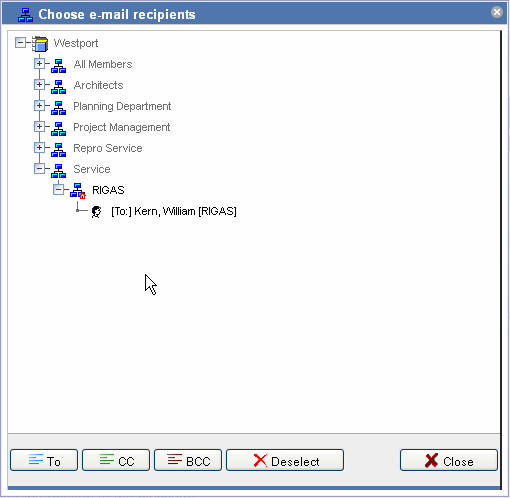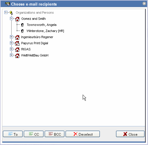 Add the persons as recipients by clicking on To, CC or BCC or selecting the corresponding entry in the context menu, which opens when clicking on the right mouse button. These options specify whether the person receives the e-mail directly (To), as a copy (CC) or as a blind copy (BCC). If you mark an organization, all persons contained in the organization are taken as recipient. Groups or persons who cannot be chosen are displayed in grey in the tree.