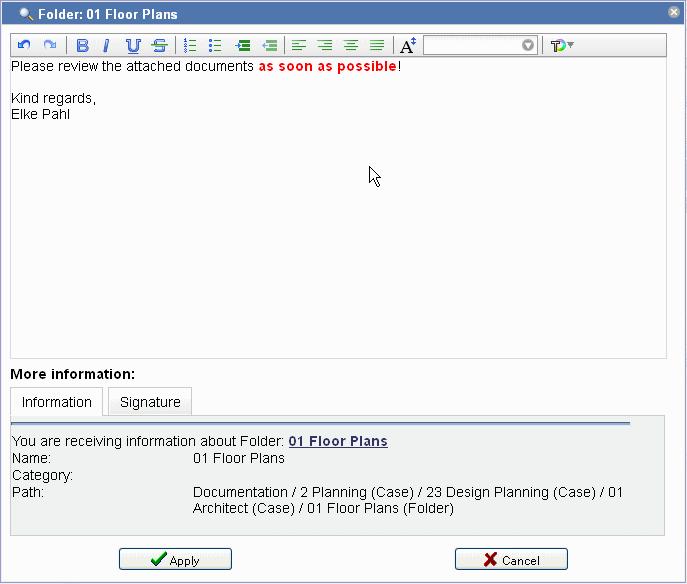 The field subject is preset with the name of the case, folder etc for which the e-mail/internal message is being sent. This text is used as subject heading of the e-mail/internal message and can be modified according to your preferences.