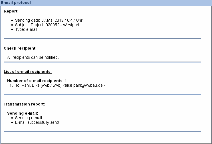 The protocol contains information about the access to documents (rights, status), the accessibility of the individual recipients (e-mail recipients need an e-mail address, message recipients need an account) as well as about the success of the transmission. If e-mails and internal messages are sent simultaneously, the protocol contains the data of both.