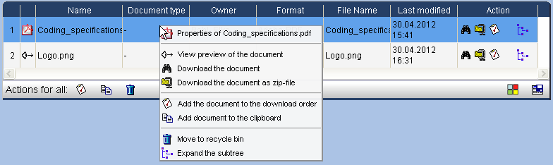 In some lists, actions can be performed on the objects displayed. These can be executed either directly in the right column, via the context menu (right mouse button) in the corresponding row or for several objects at once by ticking the box at the left side of the corresponding rows and clicking on the action symbol in the footer of the list.