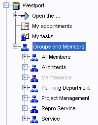 In order to create a new main group, choose the node Groups and members, or otherwise choose the group below which the new group should be created or the group which should be linked to the organization/department. Note that no subgroups can be created for the group All Members. Also, this group can not be linked to an organization.