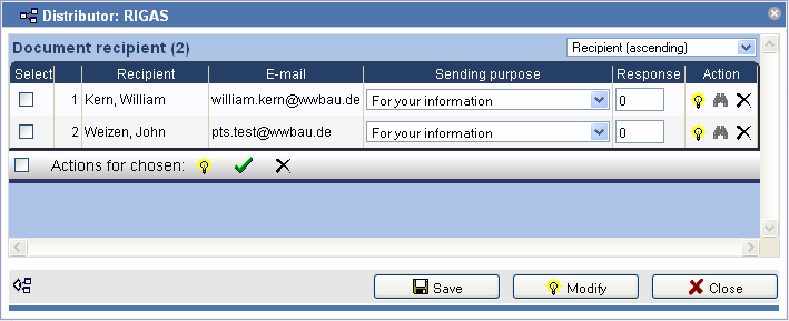 Click on Modify to include all marked recipients in the distributor and remove all deactivated recipients from the distributor. By clicking on Save, you generate a new distributor. Modify the distributor name (the preset name is that of the template distributor). Personal distributors are only visible to you..