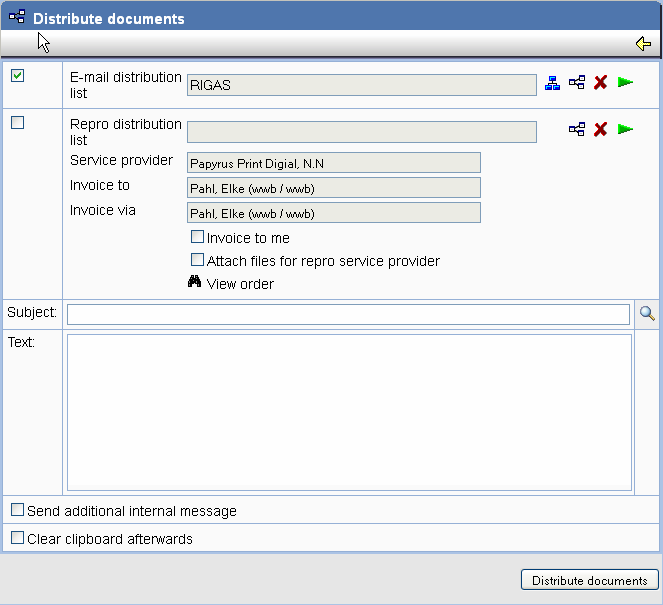 Documents in the clipboard are sent to recipients of predefined distributors by clicking on . First, the distribution form is