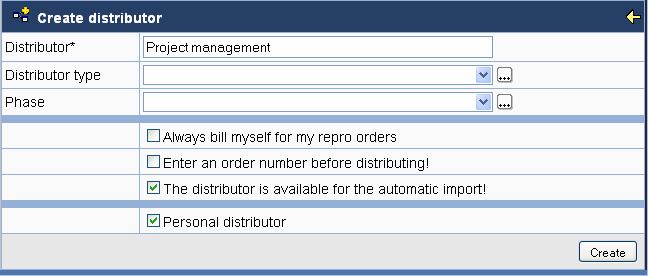 In order to be able to execute a distribution, a distributor has to be created previously. According to the type of reception, e-mail distributors and repro distributors are differentiated. Furthermore, there are group distributors which are linked to a member group. There are personal distributors (which are only available to their creator) and global distributors (which are available to all members).