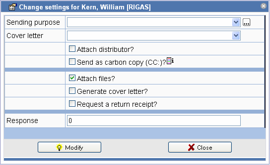 Here you can set several options: should the list of recipients be included in the generated message text (option 'Attach distributor'), if files should be attached (option 'Attach files') and if the selected cover letter should be generated. A cover letter can only be attached if 'Attach files' is activated. Apply the settings by clicking on Modify or dismiss them by clicking on Close.
